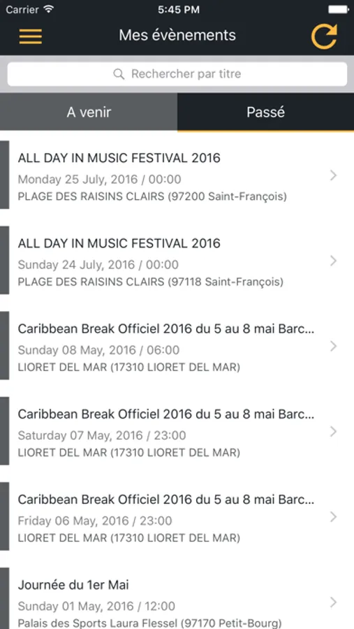 Une fois connecté, vous avez accès à vos liste de vos évènements triées via les onglets Évènements à venir / Évènements passés.