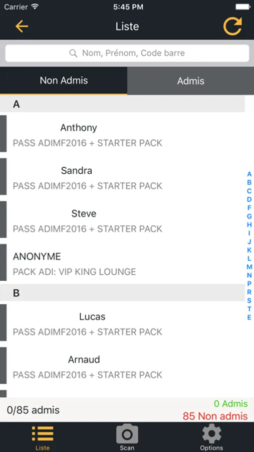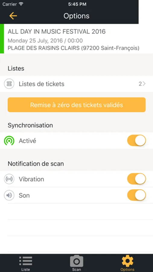 Vous devez sélectionner l'évènement souhaité. Vous avez alors accès à la liste des participants, à l'interface de scan des codes barres, et aux options.
