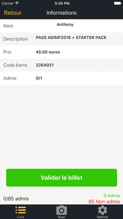 En cas de problème de lecture des codes barres, l'onglet Liste vous permet également de valider ou de dévalider manuellement les entrées. En cliquant sur un nom de la liste des Non admis ou des admis, vous avez alors accès aux détails du ticket et aux options de Validation ou Dévalidation manuelle.
