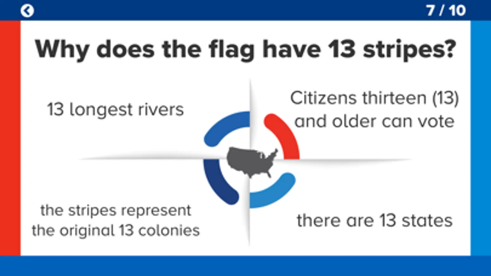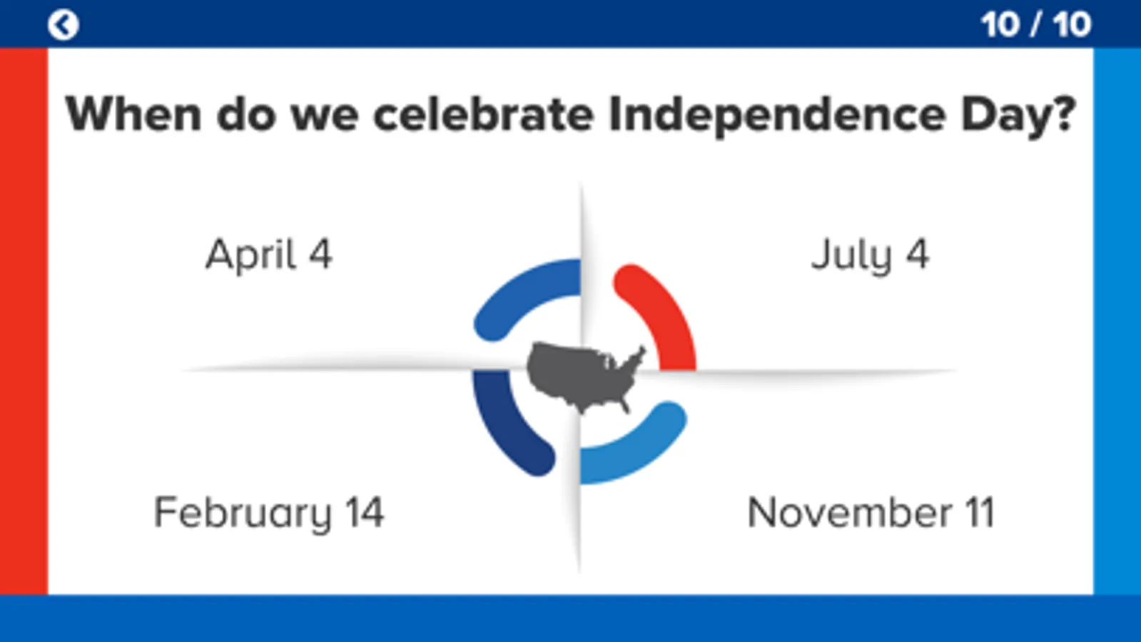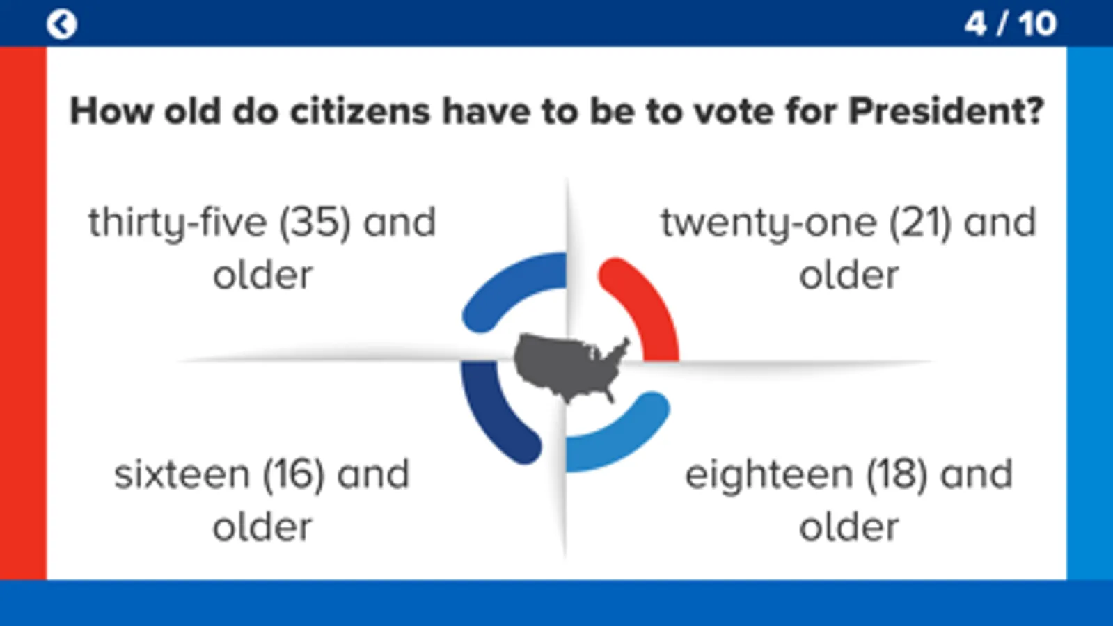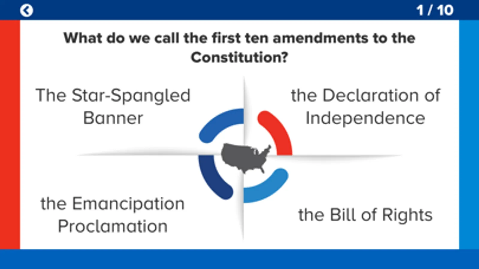 In the test, which is an oral test, an official of the USCIS (U.S. Citizenship and Immigration Services) will ask you 10 questions of the 100 questions that you can practice in this app. You will be asked the questions in English and must answer in English. You need to answer at least 6 questions correctly to pass the Civics part of the naturalization test.