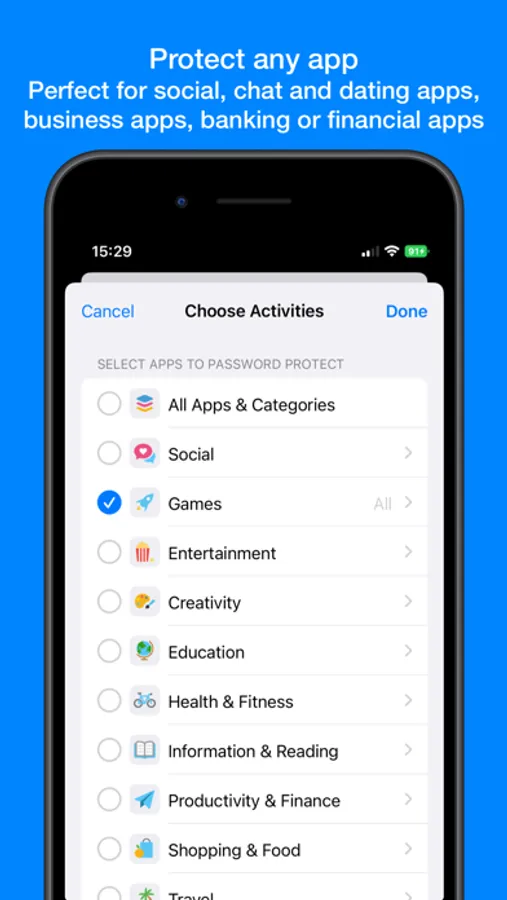With AppLocker you can password protect individual apps on your iPhone and iPad. It works with any app, Facebook, Photos, Tinder, Mail or banking and financial apps.
