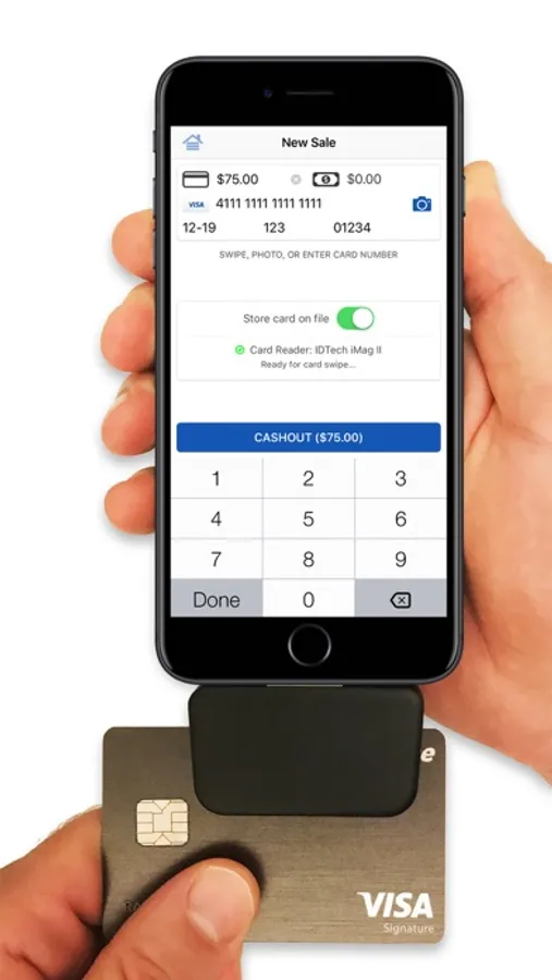 • Accept credit cards using an encrypted credit card swipe, manual entry, or photo entry. 2.75% per transaction. Next day funding. True merchant processing account.
