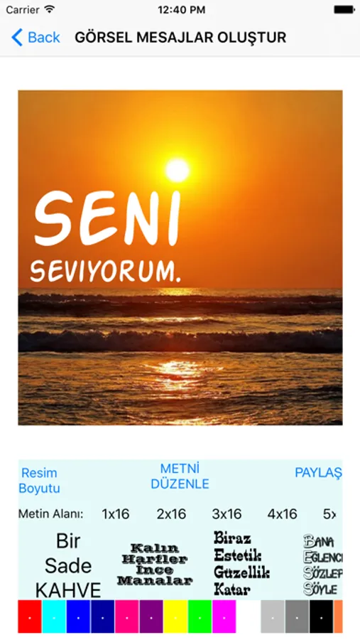 10'larca Font, 100'lerce Renk ve 1.000'lerce farklı tasarım ile metinlerinize birbirinden güzel tasarımlar ile güzellik katın. Metin tasarım türünü gösteren başlıklara her tıklamanızda, o gruptaki fontlar kullanılarak her defasında farklı bir tasarım ortaya çıkacak. Metinleri parmağınızla dilediğiniz yere sürükleyip bırakın. Resimlere en uygun rengi ve uygun metin genişliğini ayarlamanız mümkün. Bu paylaşımlarınız çok beğenilecek.