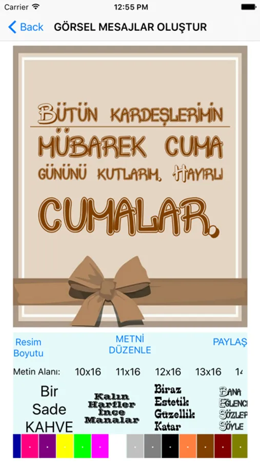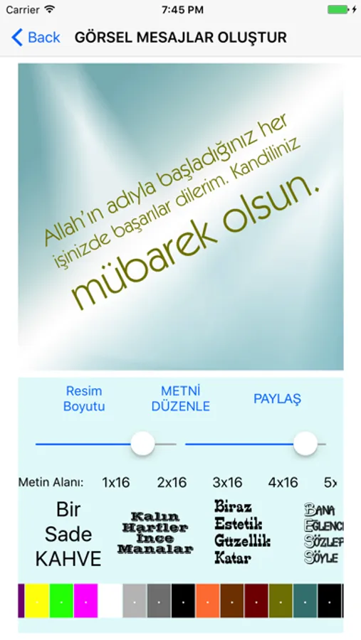 Birkaç dokunuşla kolayca, paylaşıma hazır tasarımlar hazırlayın. Bir söz, dize, mesaj vb paylaşmak istediğinizde, bunu bir görsel haline getirip paylaşmak artık çok kolay.