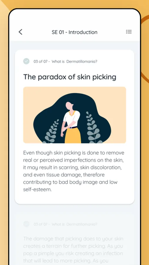 Educational Content: Explore a rich library of educational materials, such as articles, videos, and webinars, to deepen your understanding of skin picking disorder and its management. This content provides valuable insights and empowers you with knowledge.