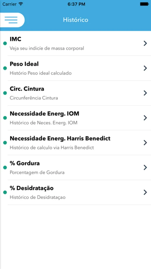 - Cálculo do IMC, Peso Ideal e Circunferência da Cintura com seus respectivos valores de referência;