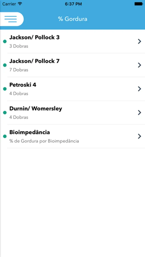 - Cálculo da % Gordura Corporal (Jackson/ Pollock – 3 dobras; Jackson/ Pollock- 7 dobras; Petroski – 4 dobras, Durnin/ Womersley, Bioimpedância) com referências;