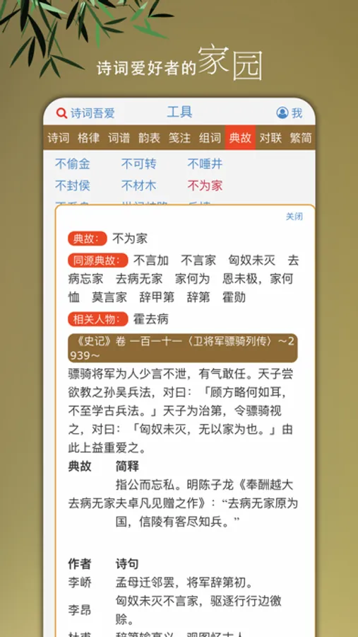 2、自动笺注、典故分析、繁简转换、组词、历代诗词检索。