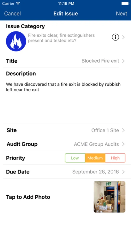 The iAudit app allows you to add comments and set a priority for each issue raised together with a named audit group and location. You can take photos of any issues to add to your audit/inspection.
