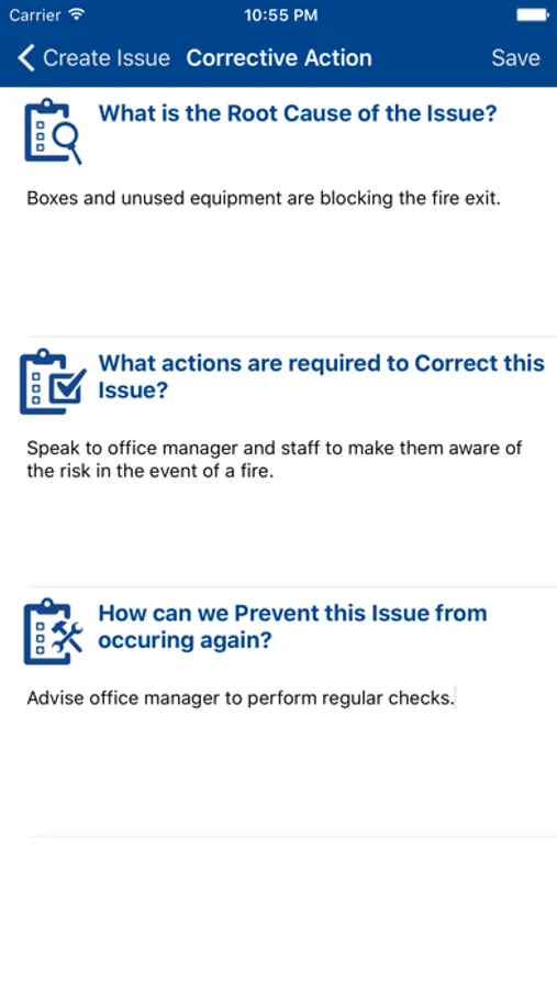 - Issue severity uses a coloured button system that automatically gives a timeframe for resolving the issue. This can however be overridden and allows for manual entry as well.