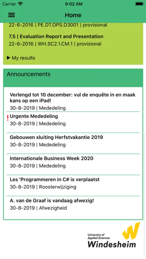 This is the official Windesheim app, which gives Windesheim students access to their personal timetables, marks, any timetable changes and announcements. You will receive a notification when a change is made. If you have any questions, problems or tips for us, please use the feedback button in the app.
