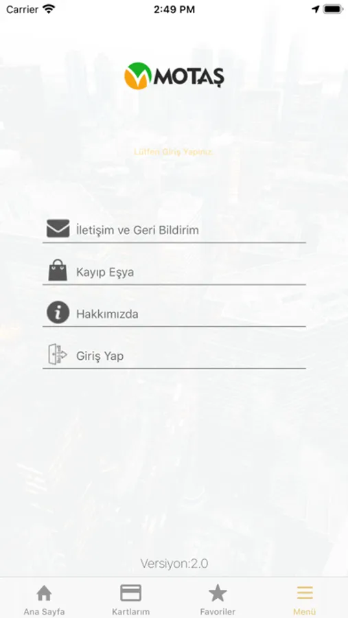 Uygulama Fonksiyonları : Otobüsüm Nerede, Bakiye Sorgulama, Bakiye Yükleme, Ücret Tarifesi, Yetkili Bayi ve Kart Merkezleri