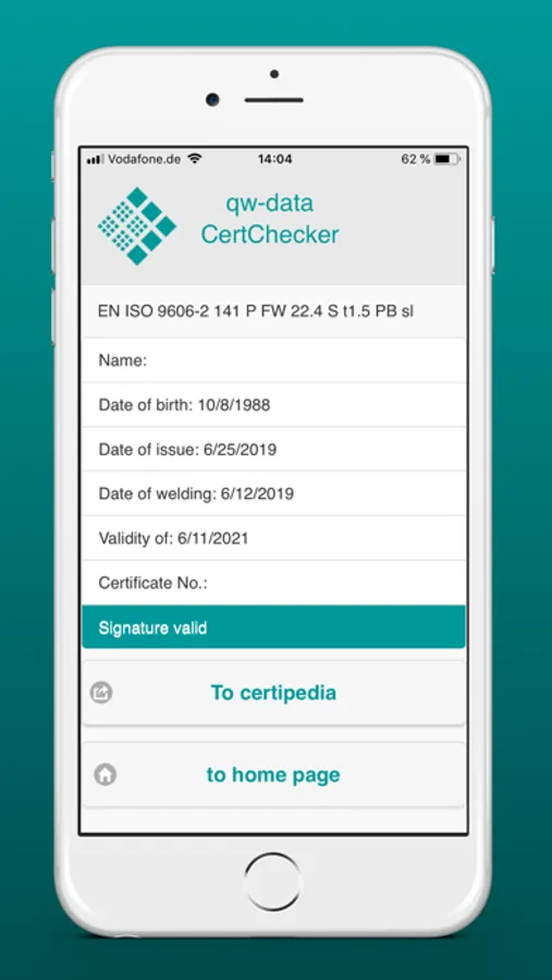 This App is a demonstrator for QR-Codes on EuroWeld certificates. You can read QR-Codes that are created by the program EuroWeld. CertChecker analyses the QR-Code and shows the parts in a readable form.