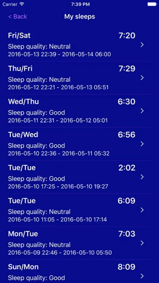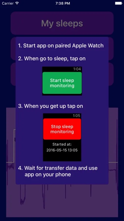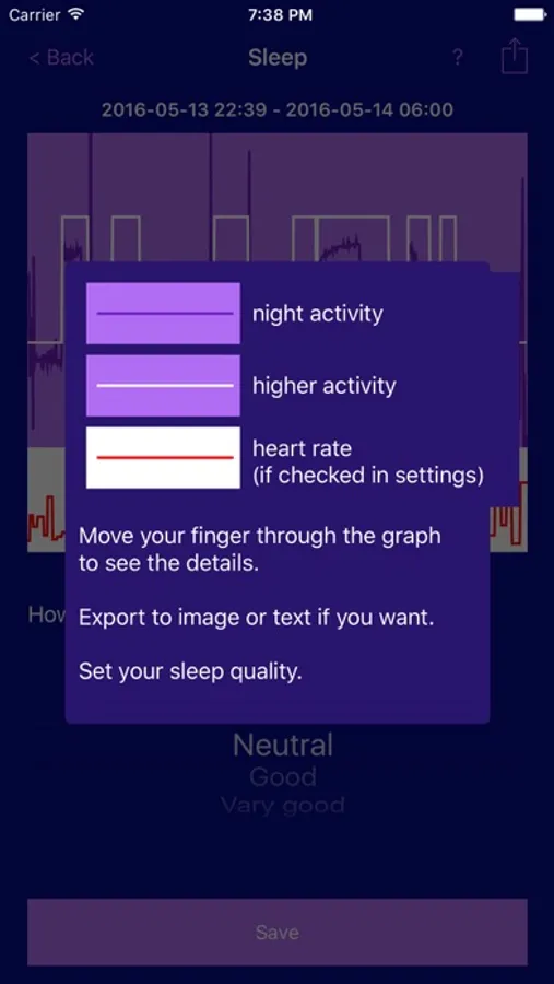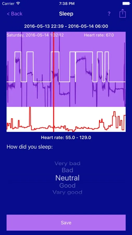 You can view recorded sleep and save it to Health application. You can see detailed info about your sleep on interactive graph with heart rate overlapped. You can also rate the sleep quality for each sleep.