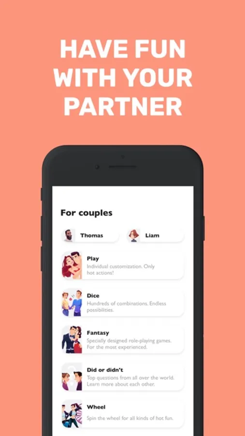 • Sex forfeits. If you have your partner around, you can play on a single device. Configure you game to your liking — you have multiple categories to choose from and 3 levels of frankness. You take turns with your partner in completing tasks. You can refuse to complete a task, but will be penalized for it.