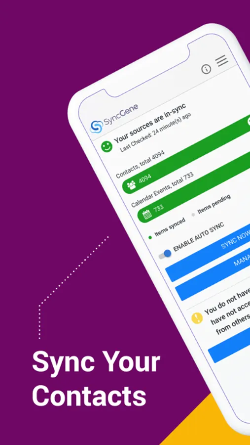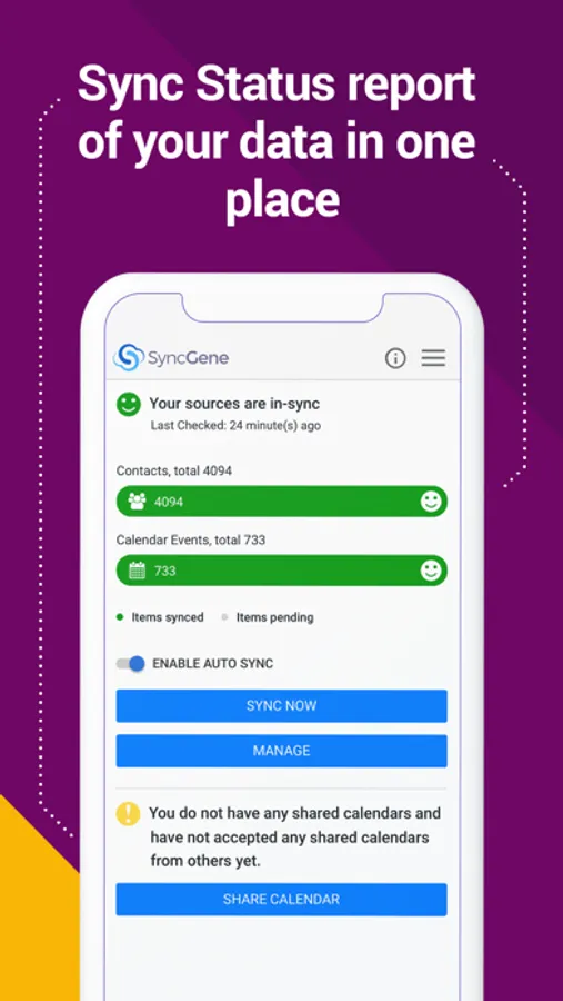 SyncGene stands out for its auto-sync, which is happening in the background. If you change anything in your data, SyncGene will automatically & constantly update all the sources and devices with the latest changes.