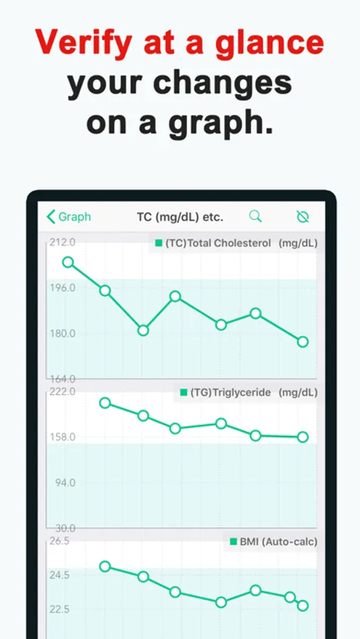 ・Verify at a glance your test results and diet changes on a graph.