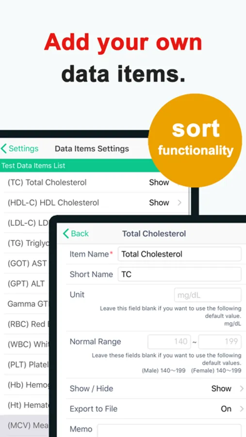 Configuration changes for adding new input data items, etc. can be made from the "Diet Data Items List" or "Test Data Items List" on the Settings screen.