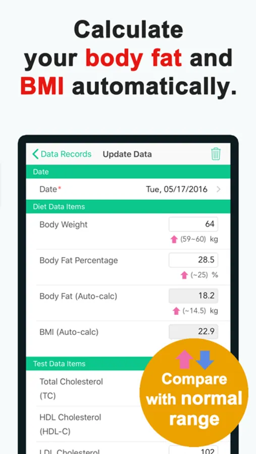 ・Calculate your body fat (kg/lb) and BMI automatically.