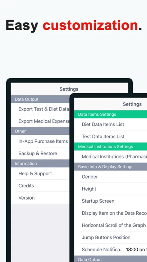 This functionality allows you to output test data, diet data, and medical expenses information recorded on the app onto files in CSV format, so they can be transferred to PCs, etc.