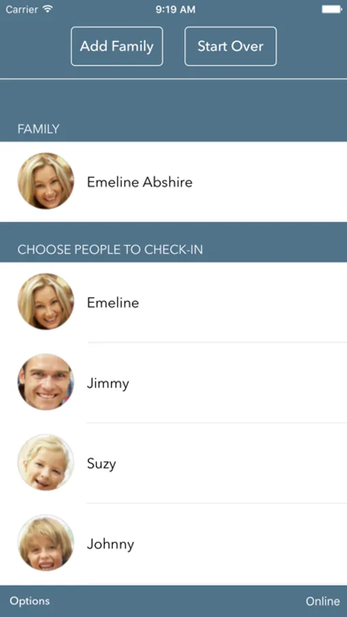 You can choose the group to check each child into, add new children and families, and edit the notes that print on the badges.