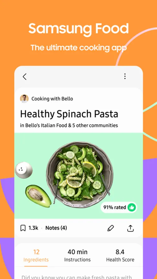 - Connect with other foodies: search, join, and contribute to communities for foodies of all types. Follow food creators and other home cooks to get inspiration. Share and receive cooking tips and kitchen tricks. Add recipe reviews or comments to help other foodies and support your favorite creators. Improve your cooking and be encouraged by the Samsung Food community.