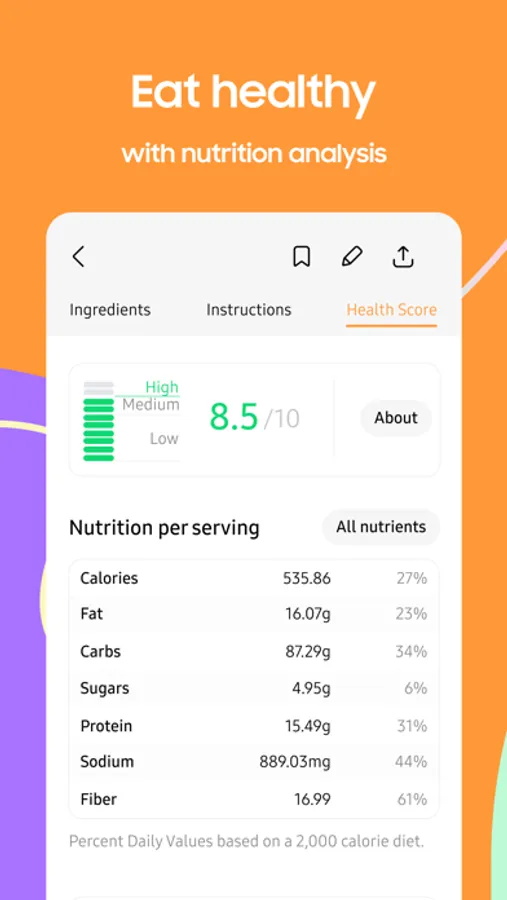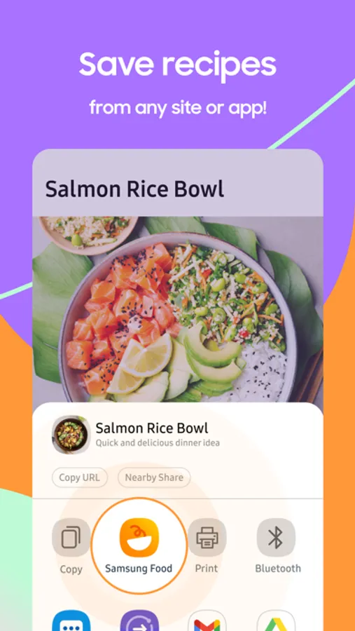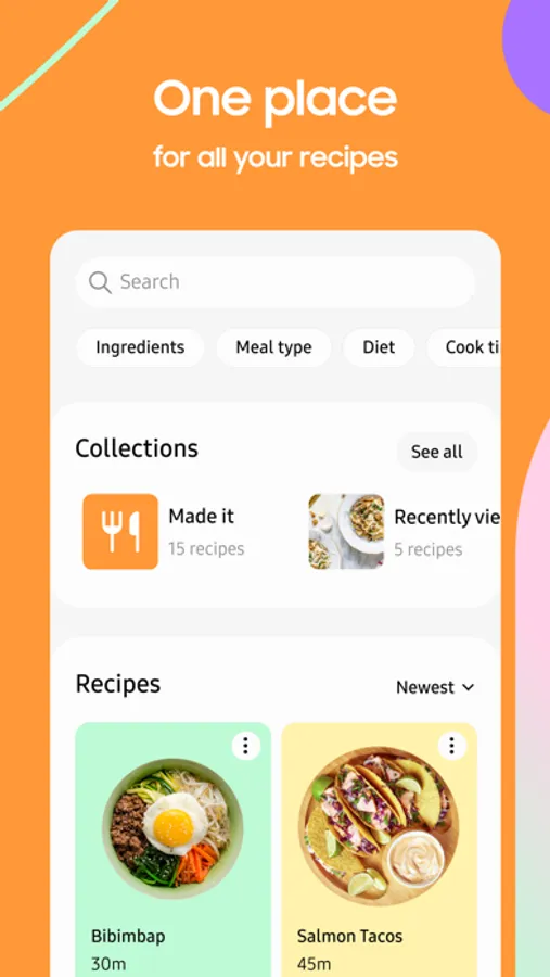 A free, all-in-one app to take you from ‘what’s for dinner’ to ‘food on the table.’ Samsung Food gives you all the food information and features you need to help you make the food, health, and cooking decisions that are right for you. Get recipe inspiration and saving, meal planning, nutritional information, automatic shopping lists, guided cooking, ingredient search, recipe reviews, and food communities in one spot.