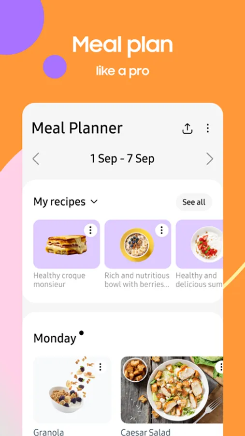 - Create and share meal plans: Use meal plans to add breakfast, lunch, dinner and snacks for the week. Share them with family or friends so everyone knows what’s on the menu. Simplify your meal planning for the week - save money, save time, and avoid food waste.