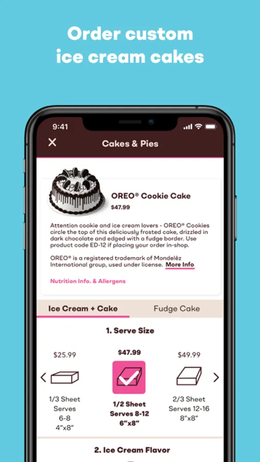 Celebrate your next special occasion with a Baskin-Robbins® ice cream cake or Polar Pizza® Ice Cream Treat! Customize with your favorite ice cream flavor and cake flavor, and place your order right in the app.