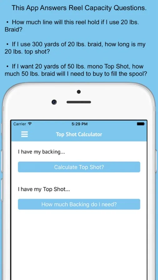 Top Shot Calculator is a fishing app to help calculate top shot or backing length. Enter in your line capacity, enter your backing, add the "lbs test" of the top shot you want and you get the yardage. Its that simple.