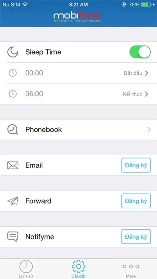 o Sleeptime: Cài đặt giờ không nhận tin thông báo gọi nhỡ