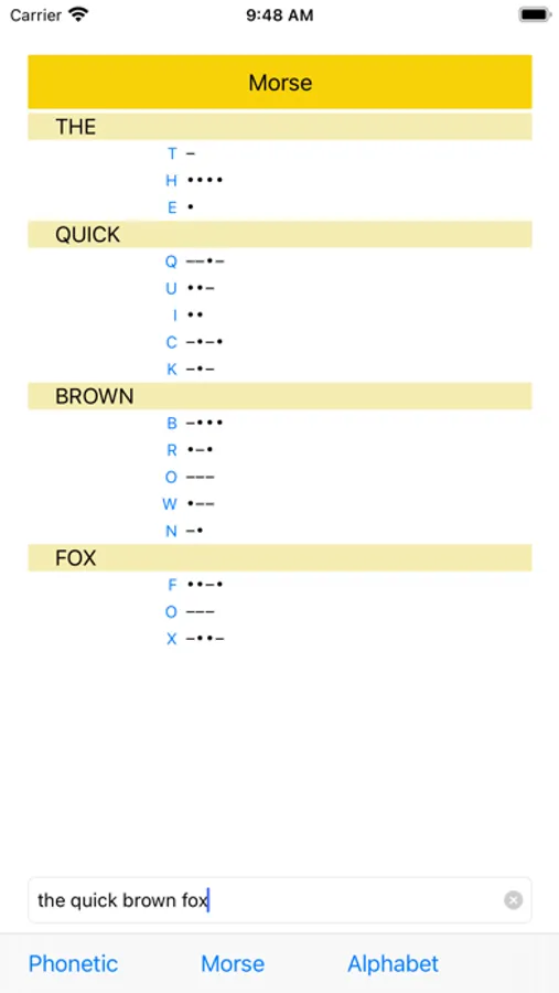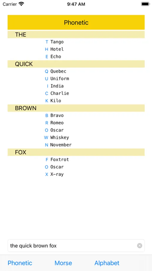 Assists the user to communicate using the NATO Phonetic Alphabet. It allows the user to type in a message and then view the phonetic representation. It is then easy for the user to scroll through the sentence and announce the message.