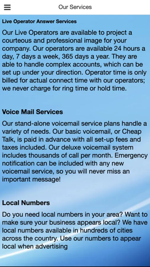 Answerphone offers a full suite of telephone answering and call center services, including email and web-based apps, 2-way texting, voice mail, IVR, appointment scheduling / reminders, and much more.