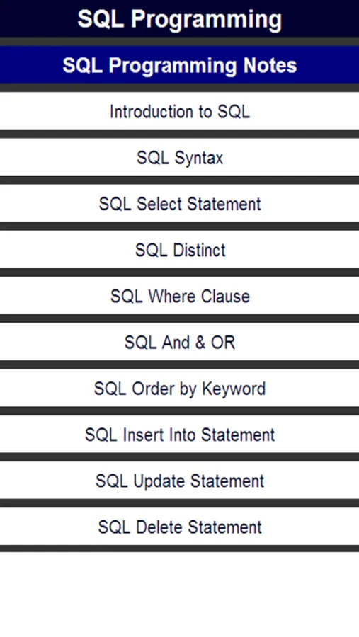 learn the sql programming ,now at your phone.The easy way of learning the sql is here, this app contains the proper notes of sql programming in a very simple language that is easy to learn and understand.