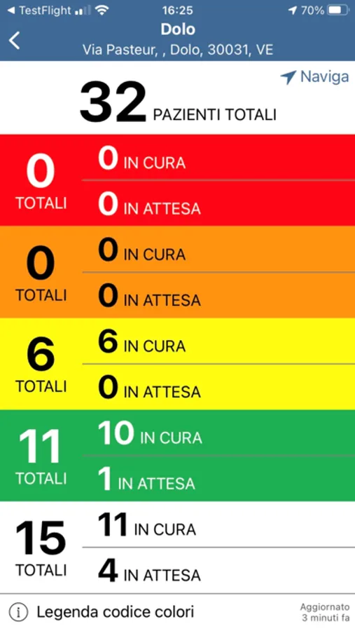 L’App permette di geolocalizzare su mappa i pronto soccorsi più vicini a te distinti per tipologia (generico, pediatrico, ginecologico, punti di primo intervento). Permette inoltre di conoscere in tempo reale il numero di persone in attesa suddiviso per codice di triage.
