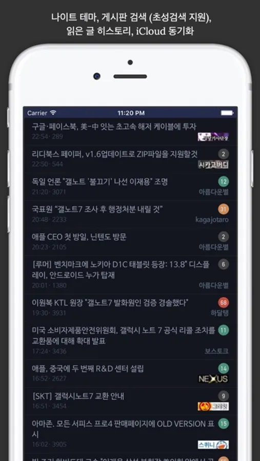 - 늦은 시간까지 편하게 눈팅할 수 있는 나이트 테마가 지원됩니다.