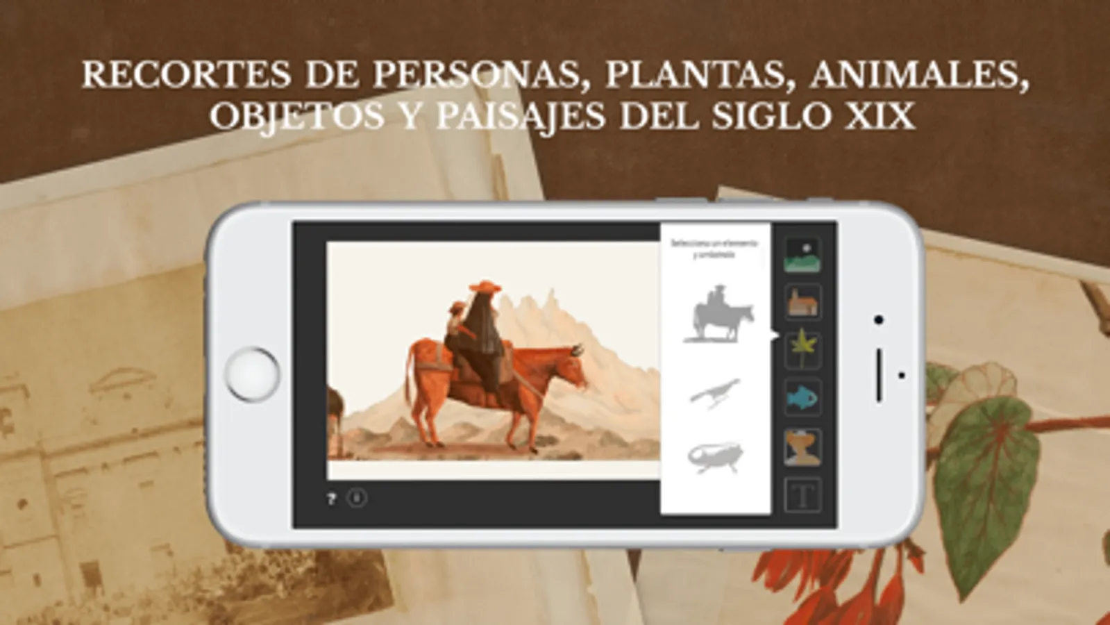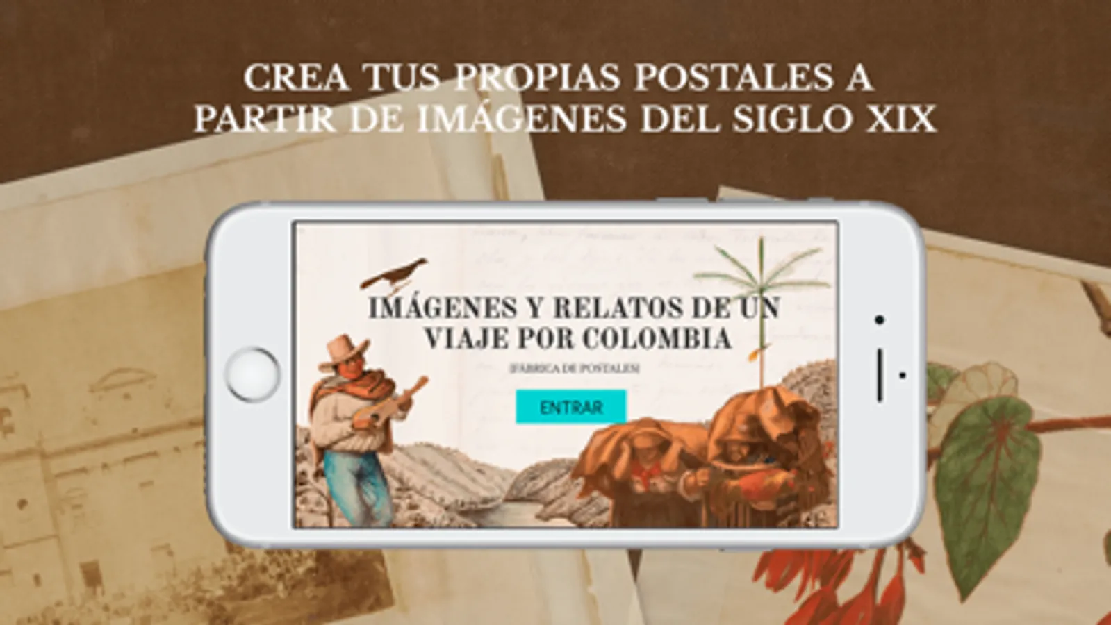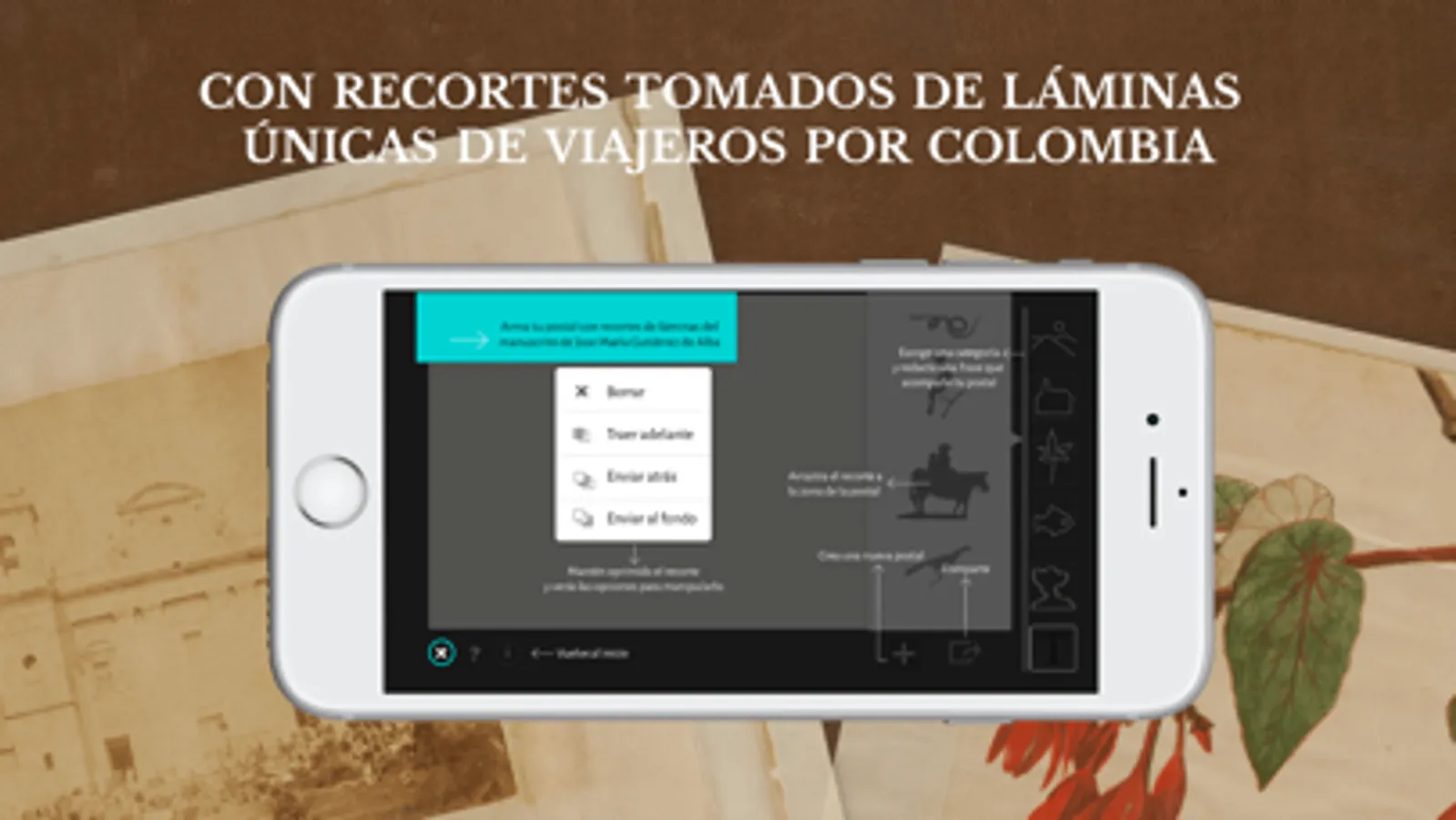 Con esta aplicación tendrás múltiples posibilidades de creación de postales, jugando con recortes de paisajes, objetos, personas, plantas y animales, tomados de ilustraciones originales del diario Impresiones de un viaje a América, del viajero español José María Gutiérrez de Alba, quien recorrió Colombia en el siglo XIX.