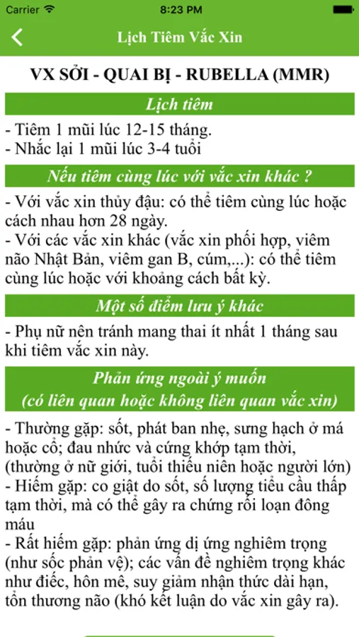 Ứng dụng này cung cấp cho phụ huynh kiến thức về tiêm chủng trẻ em lứa tuổi từ lúc mới sinh đến dưới 16 tuổi, qua đó, phụ huynh có thể tự trả lời nhiều thắc mắc của mình về tiêm chủng: