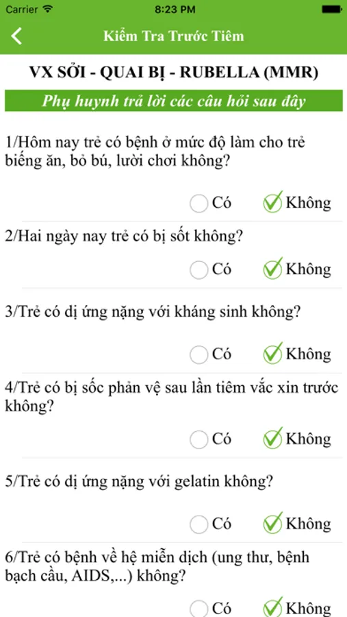 * Bộ câu hỏi để đánh giá trẻ trước tiêm. Nhằm phụ huynh tự đánh giá sức khỏe của trẻ trước khi tiêm. Nhằm trả lời cho các câu hỏi như: “Hôm nay bé có thể tiêm vắc xin này được không?”; “Cần lưu ý gì khi tiêm vắc xin này?”…