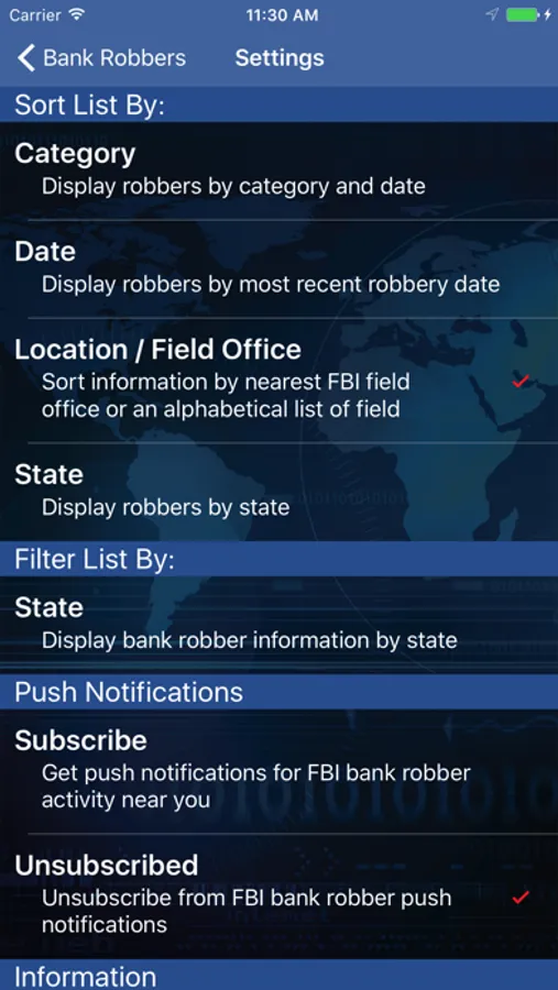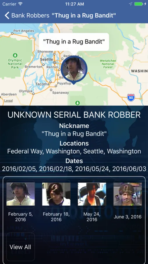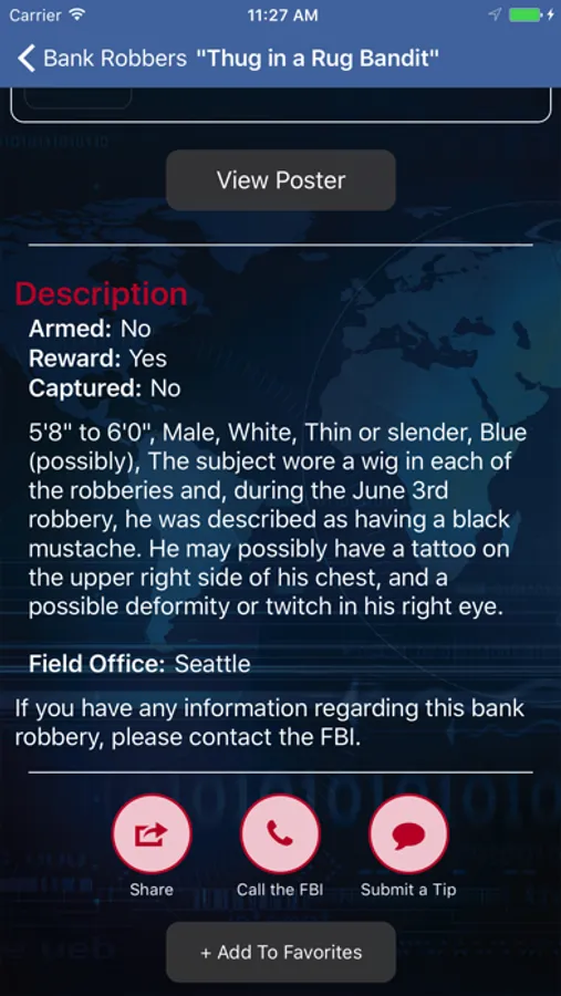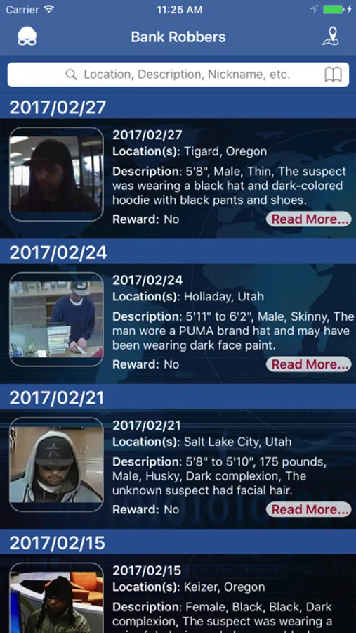 This app allows users to view information about unknown bank robbers sought by the FBI. Only bank robbers who have been uploaded to bankrobbers.fbi.gov will be displayed in this app. Not every bank robbery that occurs nationwide will be shown in this app. Users can enable alerts through the app that will inform them when a bank robbery has occurred near their location. Users can also submit tips using the app.