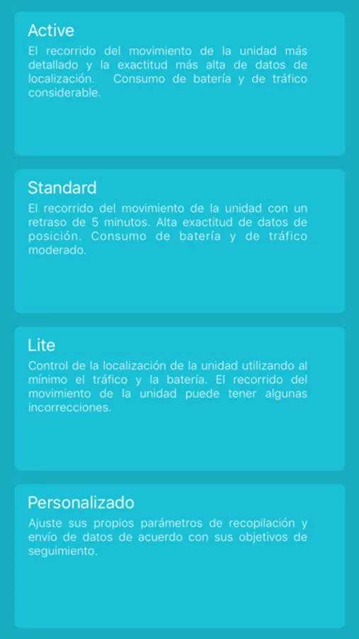 La aplicación permite escoger entre tres modos de usuario (Activo/standar/básico) de acuerdo con los objetivos de seguimiento, o crear unos propios. Debido al modo de detección de movimientos, permite ahorrar la batería del dispositivo móvil. Es posible también configurar los modos de recopilación y envío de datos para ahorrar el tráfico GPRS, por ejemplo cuandoe está en Roaming.