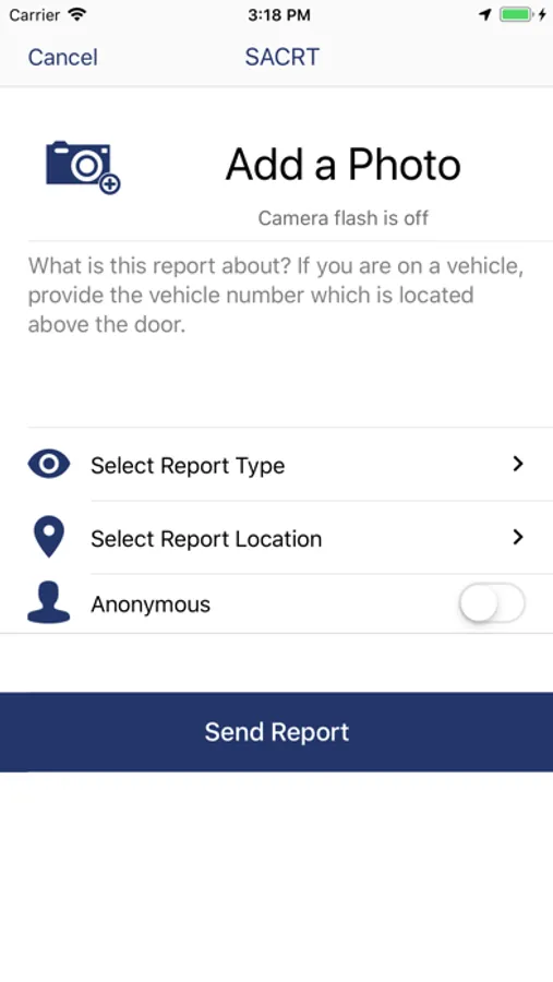 * The “Report an Issue” button allows users to send text or photos directly to RT. To ensure discretion, the camera flash is automatically disabled when photos are taken through the app. When reporting an issue, users can select locations and report categories to assist RT Police. Riders can also send reports anonymously if they chose.