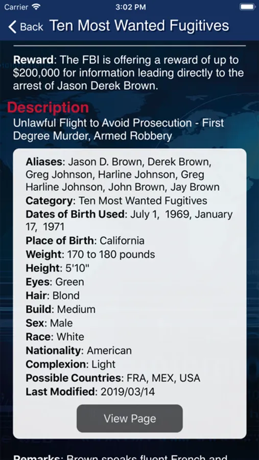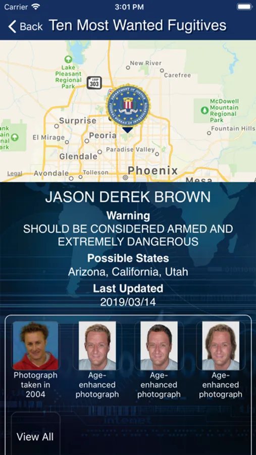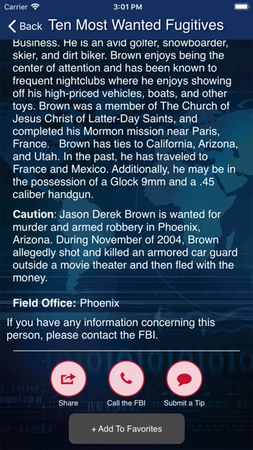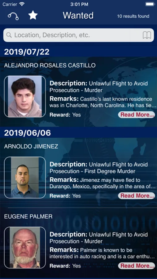 After downloading the app, scroll through the various summaries and tap “Read More” for the full profile. Profiles may include a map showing the local field office working the case, a link to the poster on the FBI.gov website, and descriptive details on the individual wanted or missing. Tap any image to enlarge the photo. Use the button at the bottom of the page to add the profile to your bookmarks page for future reference.