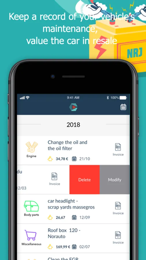 The MAINTENANCE BOOK allows you to record all the operations and expenses you perform on your vehicle, maintenance, highway, parking, fuel... as well as to download the corresponding bills. Little bonus, by entering the cost of the parts necessary for the operation you have just realized, the maintenance book allows you to CALCULATE THE SAVINGS achieved.