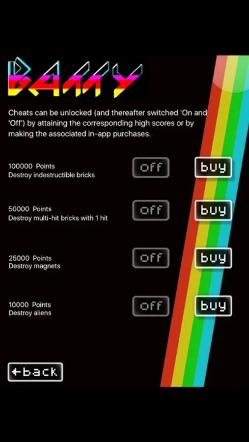 Cheats can be unlocked (and thereafter switched ‘On’ and ‘Off’) by attaining high scores or by making the associated in-app purchases.