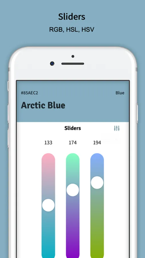 • RGB, HSL and HSV sliders for adjusting and editing colors.