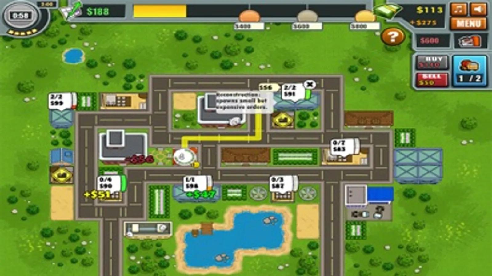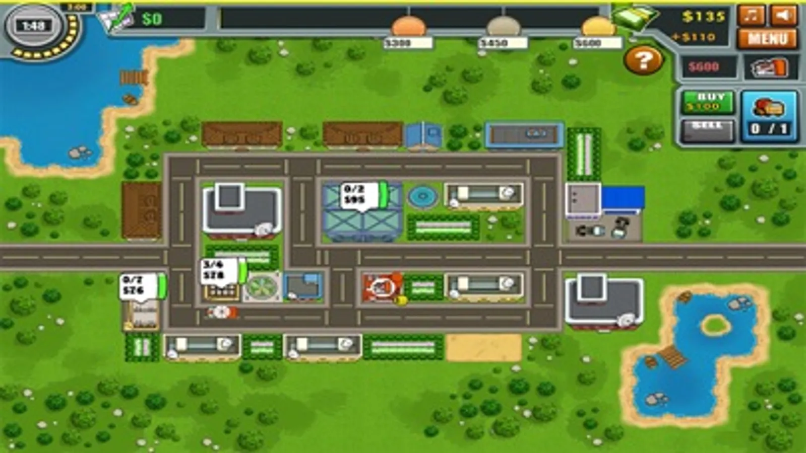 Now build your factory,that near the middle of the map, and make sure it's close to lots of building orders and buy new trucks,helicopters to deliever building materials to the surrounding lots.