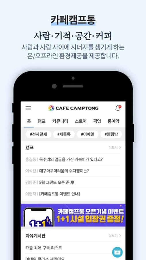 다시말해 아는 사람뿐 아니라 모르는 사람들도 온/오프라인에 모여 서로 친해지게 되고 그 과정에서 새로운 가치와 다양한 컨텐츠가 만들어지는 기적을 만드는 온/오프라인 공간이 카페캠프통입니다.