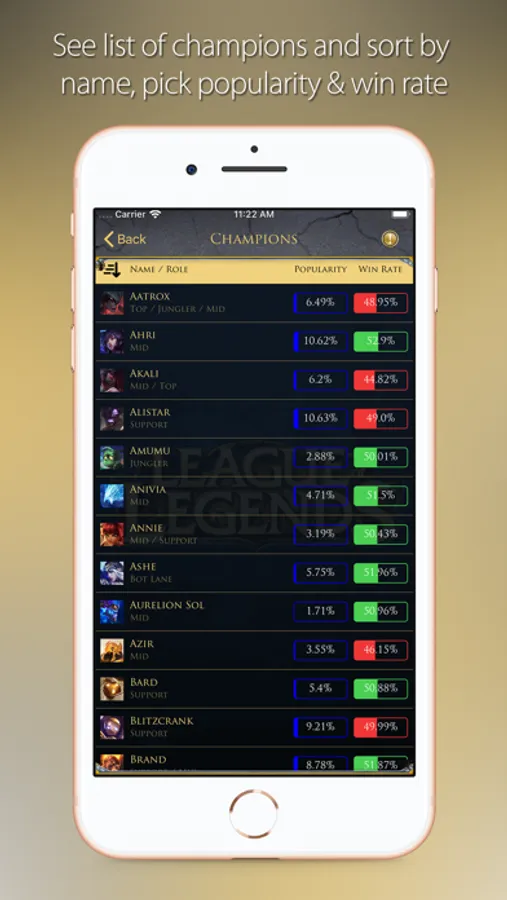 - From the Champions section; for each champion you can see their roles, popularity, winning rates, the most popular talent rank, and the cost and waiting times per skill. You can also sort the list of champions by name, popularity and winning rates.