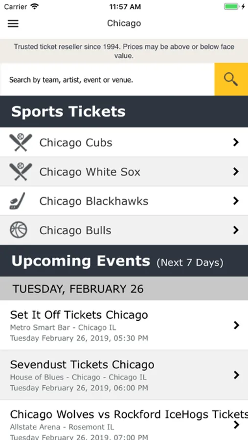 Since 1994, fans in and around Chicago have trusted Gold Coast Tickets with all of their ticketing needs! Whether you are looking to attend a sold-out event, treat clients to great seats, or grab last-minute tickets on the go, we've got you covered. We specialize in buying AND selling tickets to the Chicago Blackhawks, Bears, Bulls, Cubs, White Sox, and Fire. But we don't stop there - we also carry the largest in-stock inventory of tickets to the hottest concerts, theatre, and comedy events in and around the Chicago area.